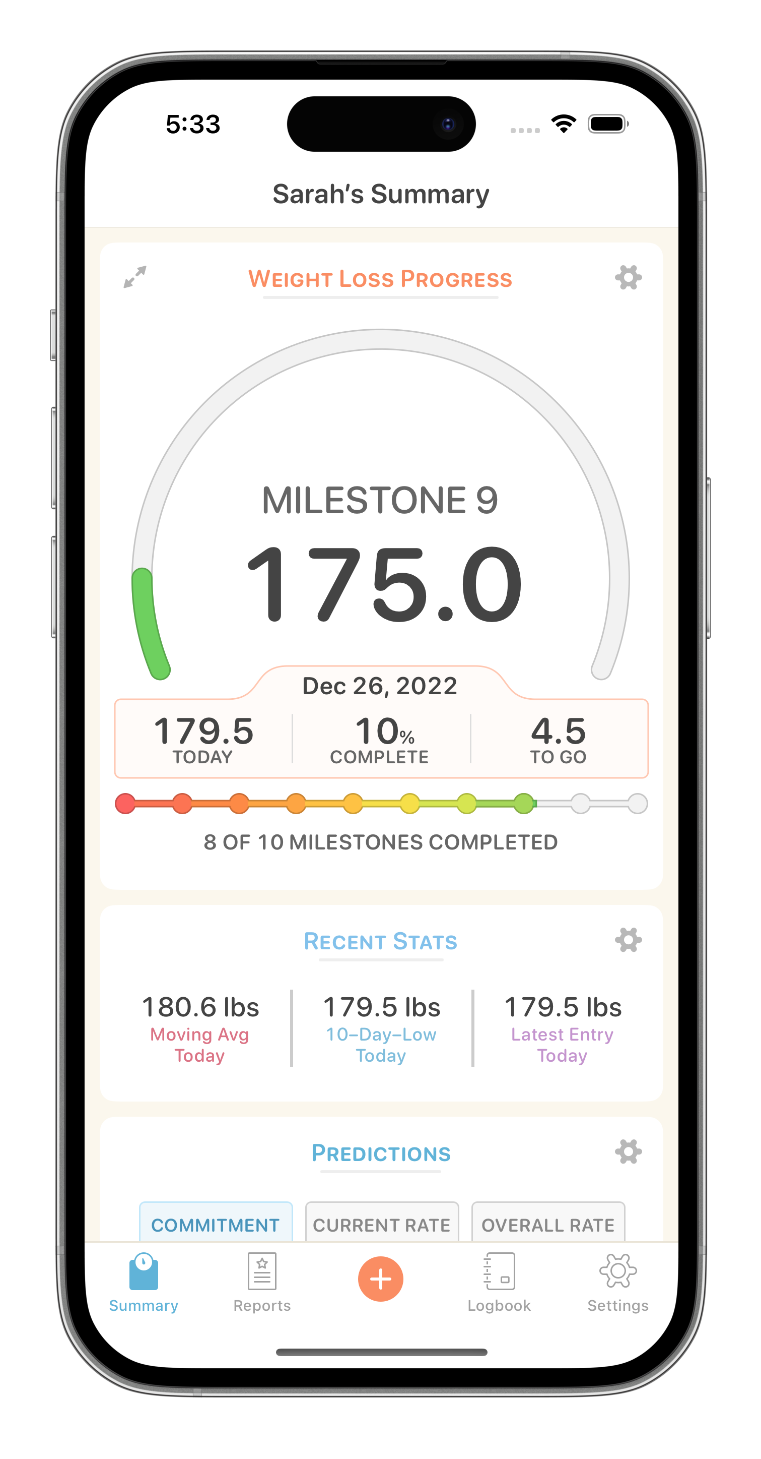 With other weight loss apps, you have to record your weight for several weeks before you can start to understand how much weight you're losing and when you'll hit certain weights. But if you input those same weights into Happy Scale, it will use fancy math behind the scenes to give you insights into how quickly you're losing weight and when you'll achieve your goals!